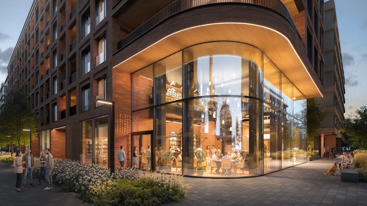 Widok pierzei budynku B1 z restauracją